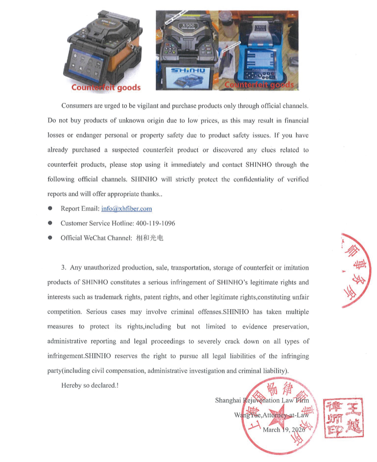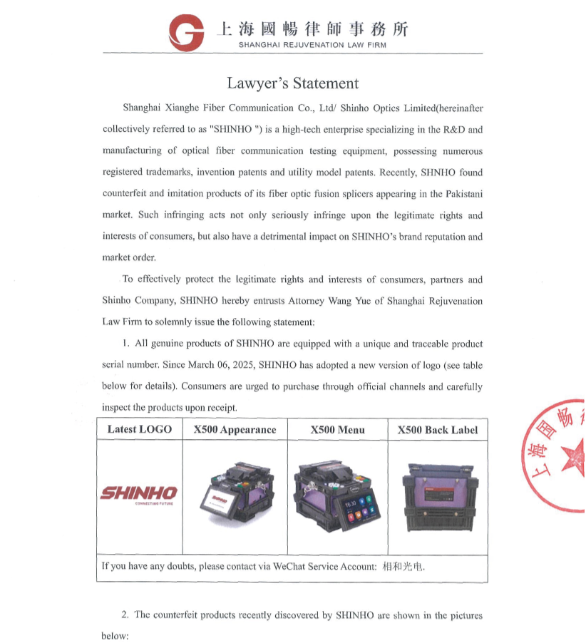 Dichiarazione dell'avvocato in merito alla giuntatrice a fusione per fibra ottica SHINHO X-500 contraffatta presente sul mercato pakistano.